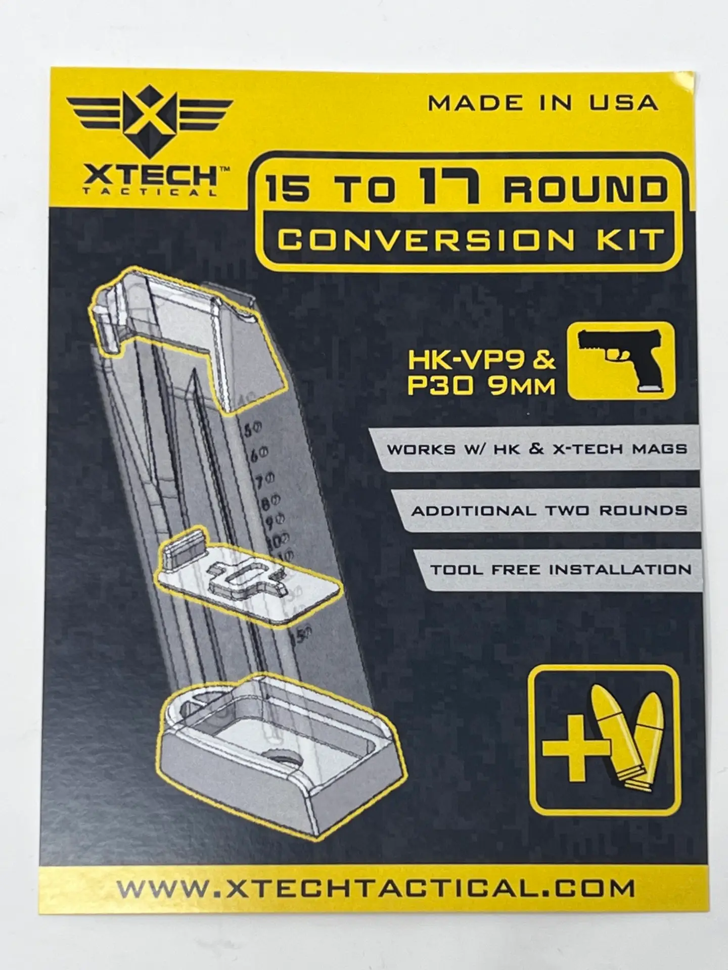 The XTECH HK VP9SK magazine extension for 15-round mags gives your custom gun two more rounds for a total capacity of 17 rounds. This kit includes an HK VP9 extended baseplate that uses your existing spring to give you reliable feeding along with greater tactical flexibility. Engineered for tool-free installation, it’s a beginner-friendly foray into tailoring your weapon to meet your shooting needs.